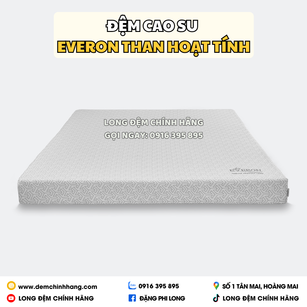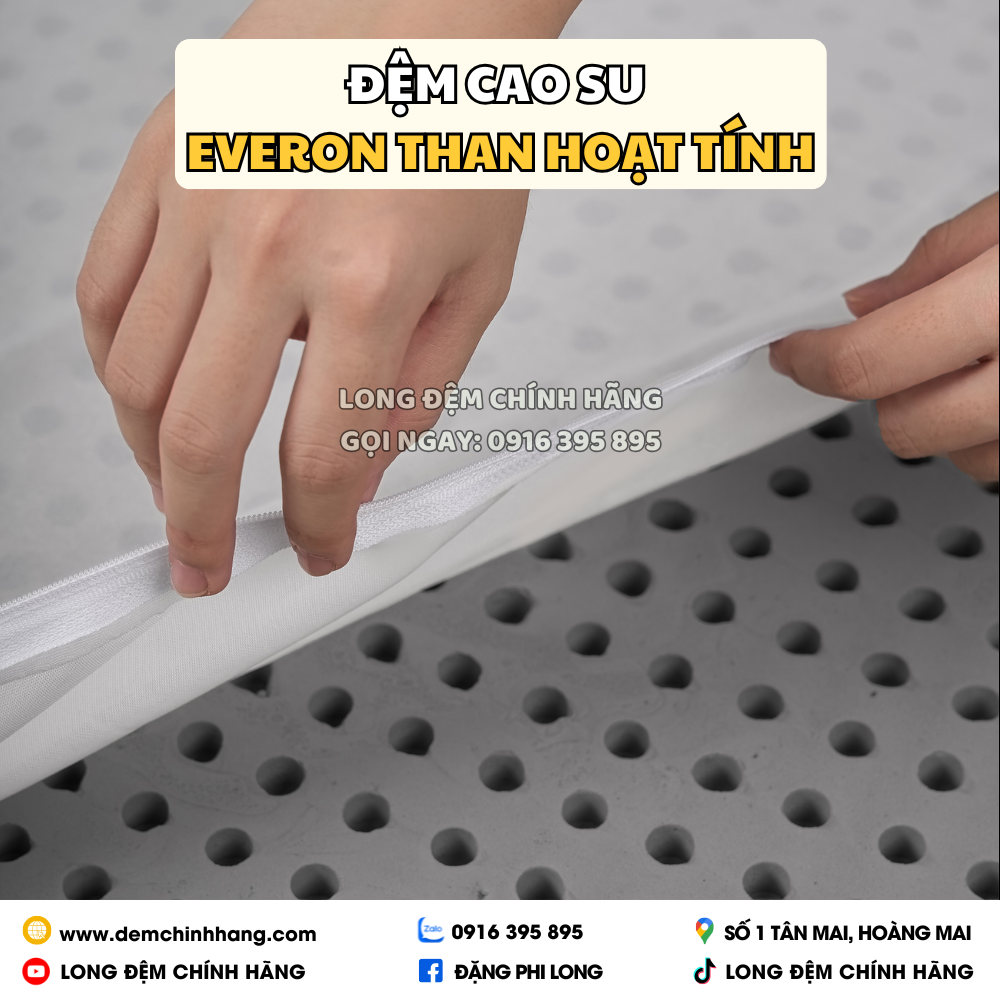 Đệm cao su Everon 100% thiên nhiên than hoạt tính - Natural Charcoal Latex sử dụng nguyên liệu 100% cao su thiên nhiên, kết hợp với than hoạt tính, ngăn chặn vi khuẩn xâm hại và bụi bẩn lên tới hàng chục năm. Kết cấu đệm cao su nguyên khối, giữ khả năng nâng đỡ bền bỉ và linh hoạt với cơ thể người nằm.